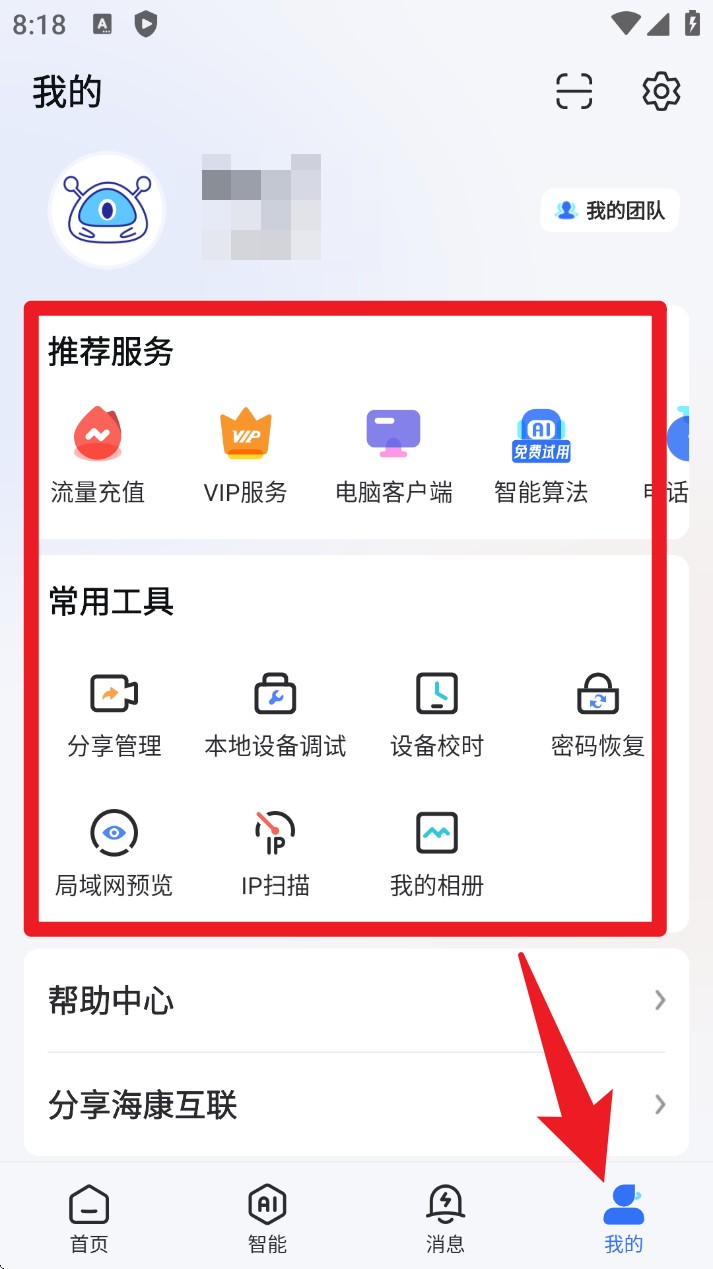 3. 登录成功后点击底部菜单栏的我的,可进入个人中心,管理推荐服务、常用工具、设备调试与设置选项。