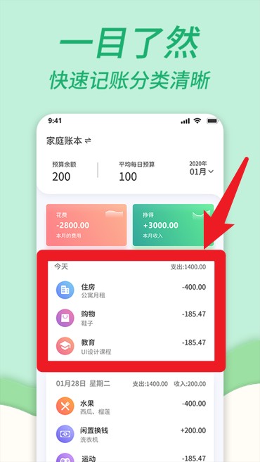 2、首页展示今日各类支出明细,分类清晰,一眼可查当天花费情况。