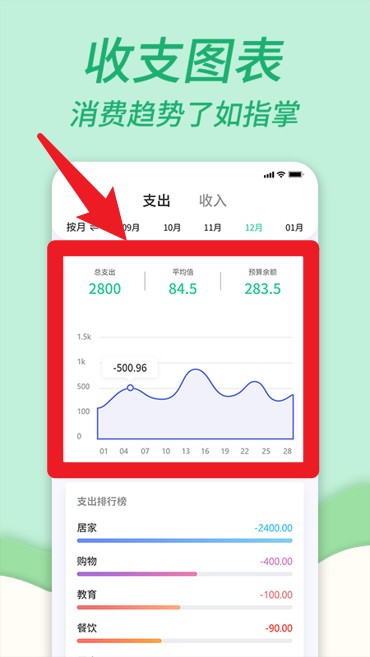 3、图表页面通过折线图展示支出趋势,帮助用户掌握消费节奏与变化。