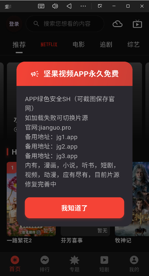 官方与备用地址:提供了主官网(jianguo.pro)和多个备用地址(jg1.app, jg2.app, jg3.app),以防主域名无法访问。这通常是这类软件保证其持续可用性的常见做法。