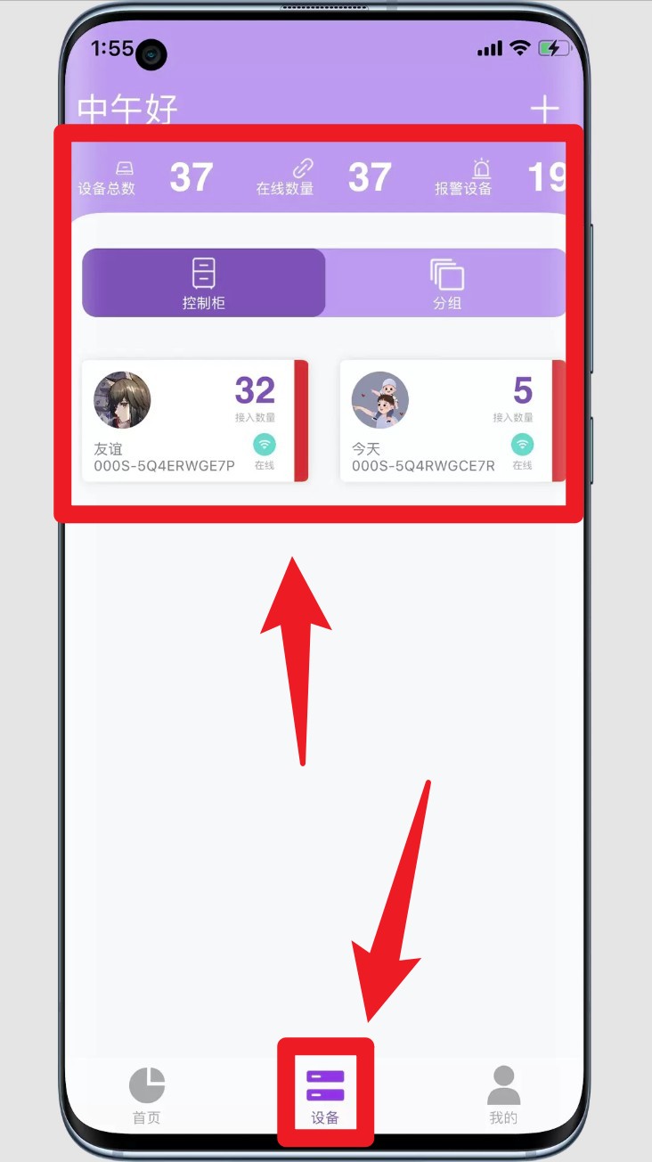 2. 切换至设备页面,查看当前控制柜或分组设备接入情况,支持快速识别在线状态。