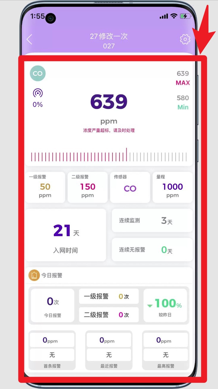 3. 点击具体设备卡片进入详情页,查看气体浓度、报警等级、设备运行时间等详细数据。