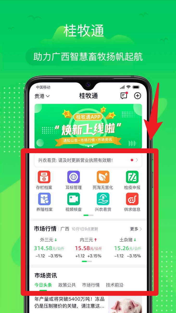 1. 打开APP进入首页,可查看存栏、耳标、检疫等功能入口,也能浏览市场行情与农业资讯。