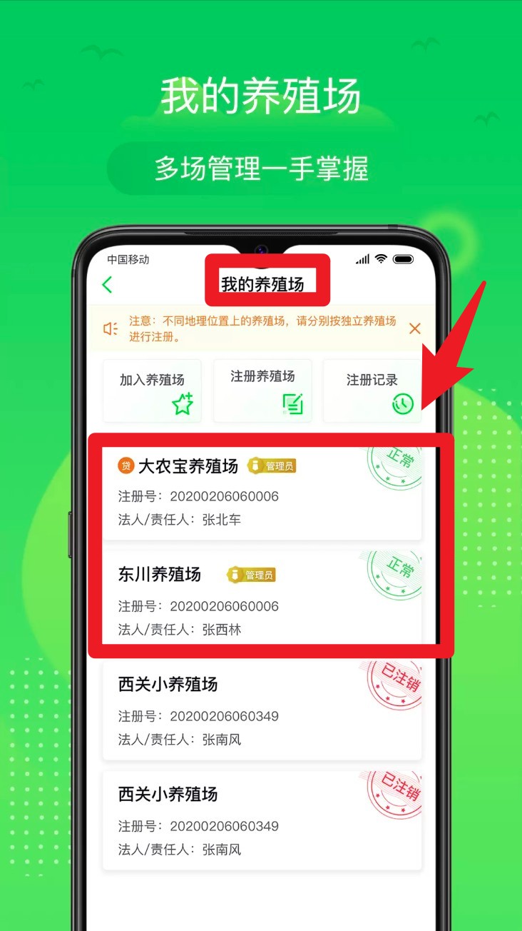 支持同时添加并管理多个养殖场档案,实时切换查看各场运营数据,集中呈现业务办理进度与审批状态。