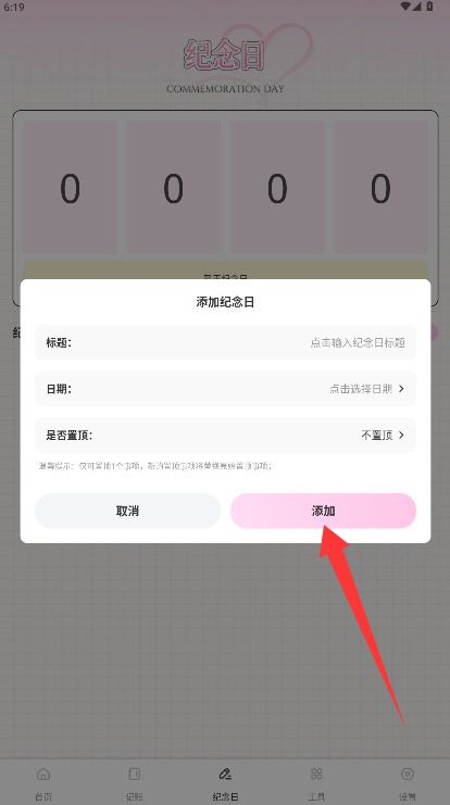 4、输入纪念日名称标题、具体日期及置顶设置选项,确认后即可成功添加纪念日记录。