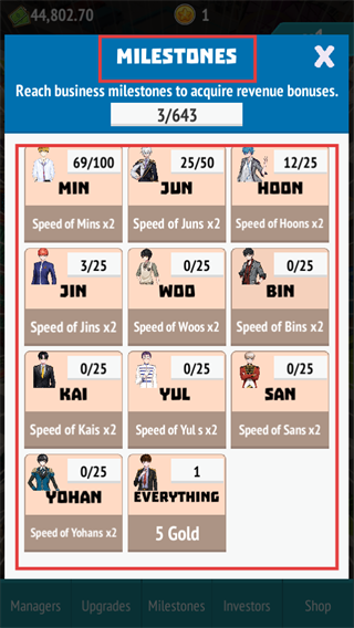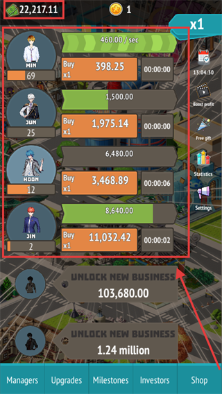1、通过点击偶像的【Buy】按钮升级【MIN】【JUN】【HOON】【JIN】等,提升每秒收益,积累资金解锁新业务,扩大偶像团队以增加总收益。