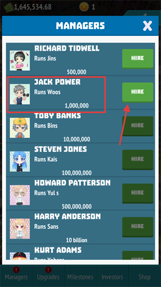 3、当资金足够时,雇佣【JACK-POWER】等经理,其可管理【Woos】类偶像,自动运营解放操作,优先雇佣成本可负担的经理,提升运营效率。