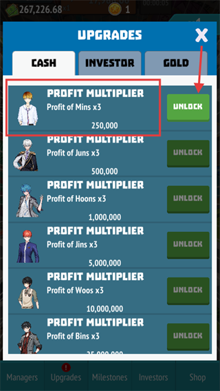 4、在【UPGRADES】的【CASH】页,优先解锁低花费高回报的升级如【MIN】的利润乘3,花费25万解锁后可大幅提升对应偶像收益,加速资金积累。