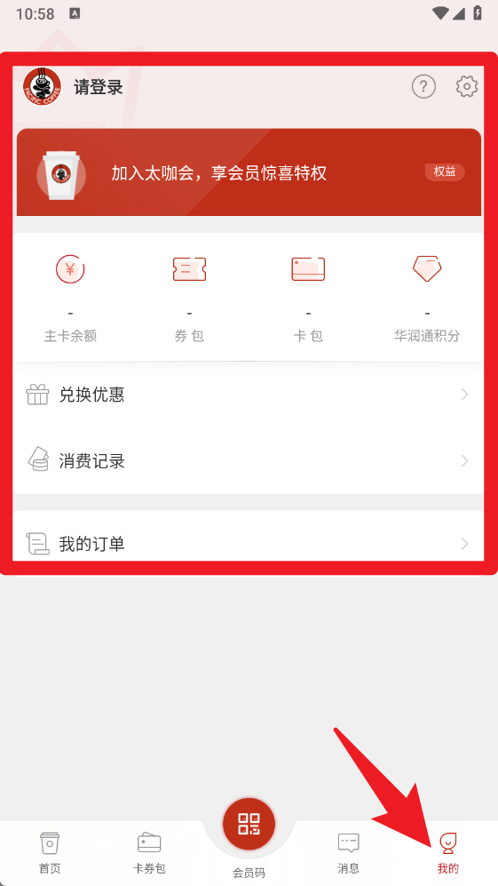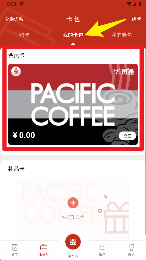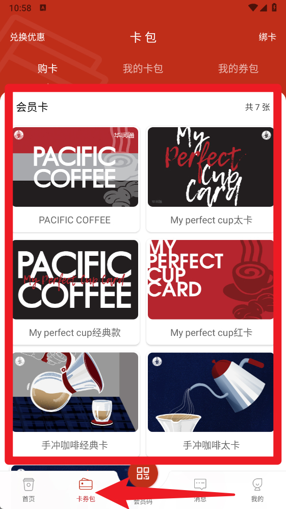 3、点击卡券包进入会员卡专区,可以购买、查看和管理各种咖啡会员卡。