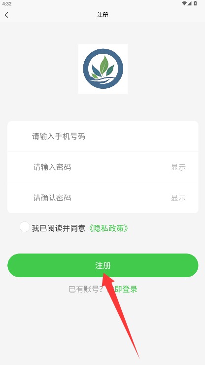 1、输入手机号码,设置登录密码并勾选同意隐私政策后点击注册按钮完成创建。