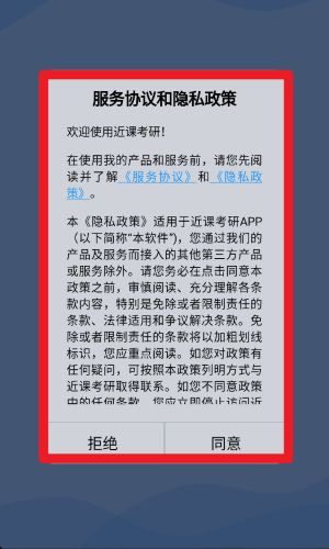 1、首次进入近课考研app时,系统会弹出服务协议和隐私政策提示,用户需认真阅读并选择同意方可继续使用。