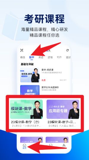 3、打开首页,在考研课程界面,可以通过顶部导航栏选择所需学科,例如数学、英语等。