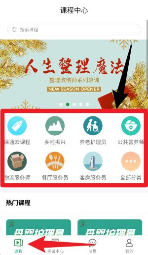 2、进入课程中心后,可在课程分类中选择课程云课堂、养老护理员、公共营养师、餐厅服务员等不同培训方向。