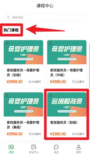 3、继续下滑页面,在热门课程栏目,可以直接查看母婴护理员、客房服务员等热门职业培训课程。