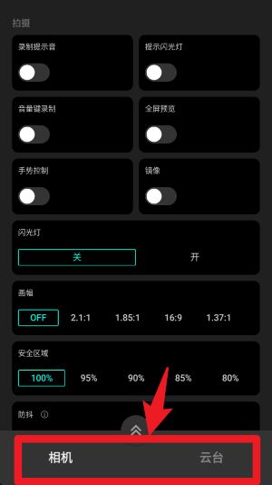 3、在拍摄设置页面,用户可以根据需要开启录制提示音、手势控制等功能,同时还能调整画幅比例与防抖等级。