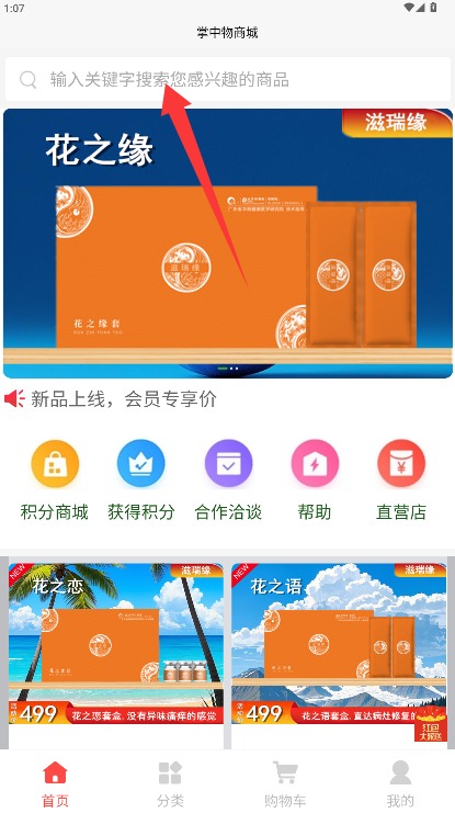 3、在首页商城顶部搜索栏输入商品名称或相关关键词,搜索需要的商品进行浏览。