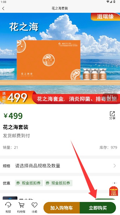 4、进入商品详细信息界面后,点击页面右下角立即购买按钮即可完成订购流程。