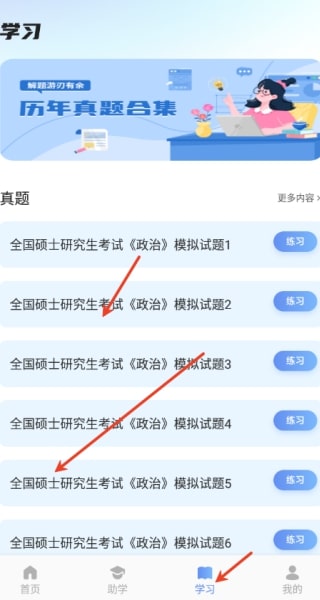 4、点击 “学习” 按钮,系统会提供各类历年真题,供开展模拟测试。