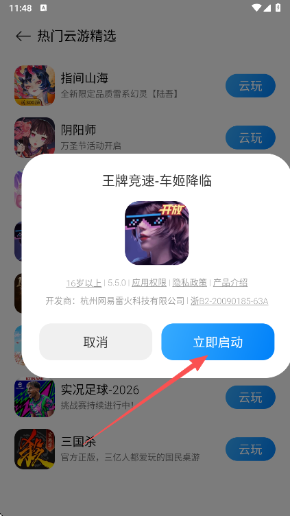 4、选中游戏后点击 “立即启动”,无需下载即可直接进入游戏体验。