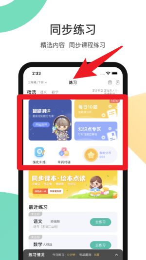 5、在练习栏目中可进入智能测评、每日10题、知识点专练等区域,全面提升学生的学习能力与效率。