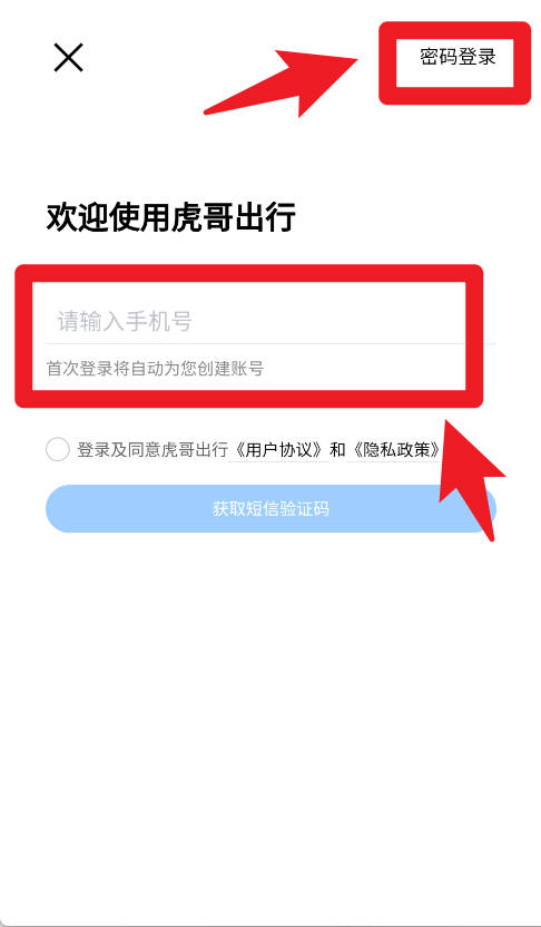 1、在登录界面,用户需要输入手机号进行注册或登录,也可以选择密码登录方式,首次登录会自动创建账户。