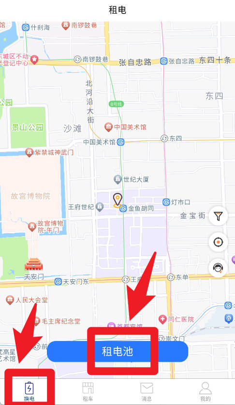 2、在租电界面,用户可以通过地图查看附近站点并点击租电池按钮,方便快速找到并租赁所需电池。