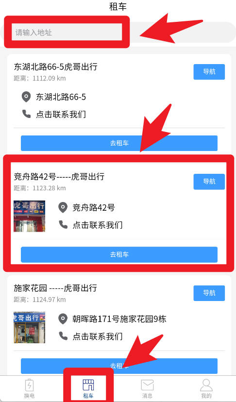 3、在租车界面,用户可以输入地址搜索附近门店,系统会显示门店信息、联系方式以及租车入口,方便就近选择。