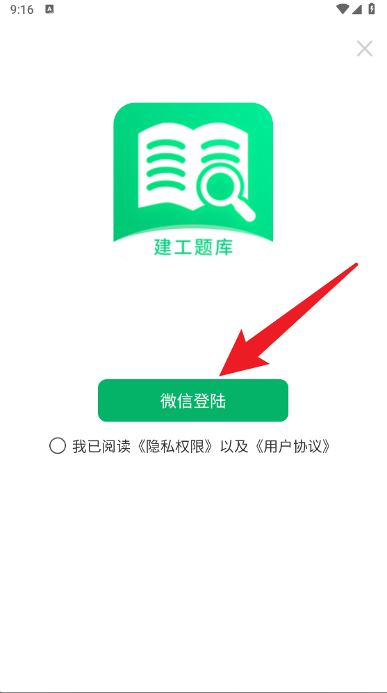 1、首次打开建造师题库宝典时,点击微信登录按钮完成账号绑定,勾选阅读隐私权限即可进入主界面。