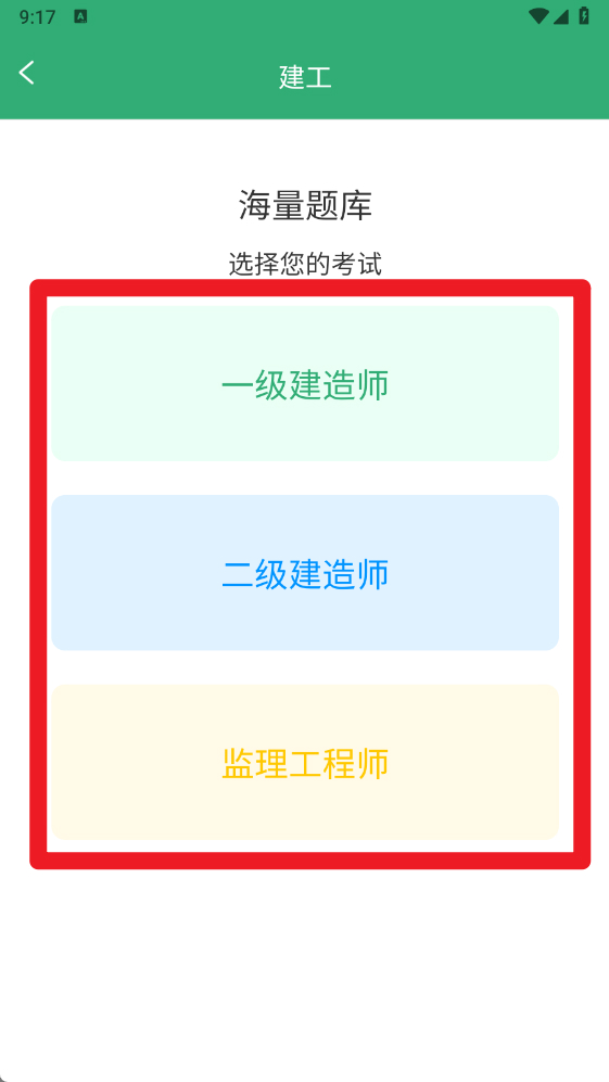 2、在考试选择页面中,用户可以根据自身需求选择一级建造师、监理工程师考试类型,确保学习方向明确。