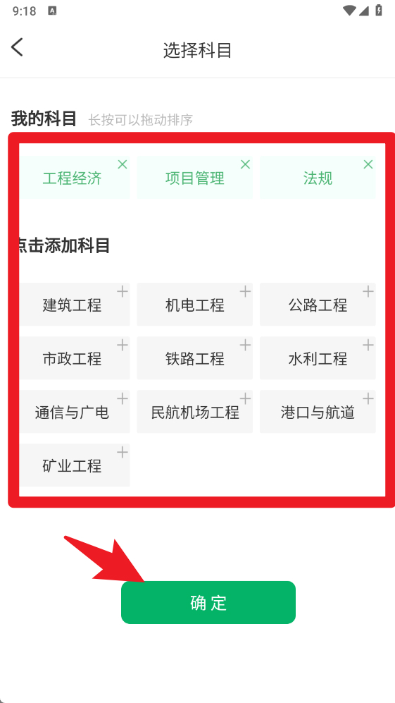3、进入科目选择界面后,可以点击添加或删除科目,例如工程经济、法规等,设置完成后点击确定保存。