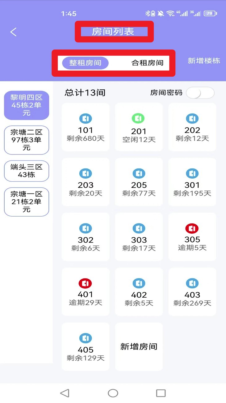 3. 点击房间列表可切换查看整租或合租房源,快速掌握剩余天数与状态。