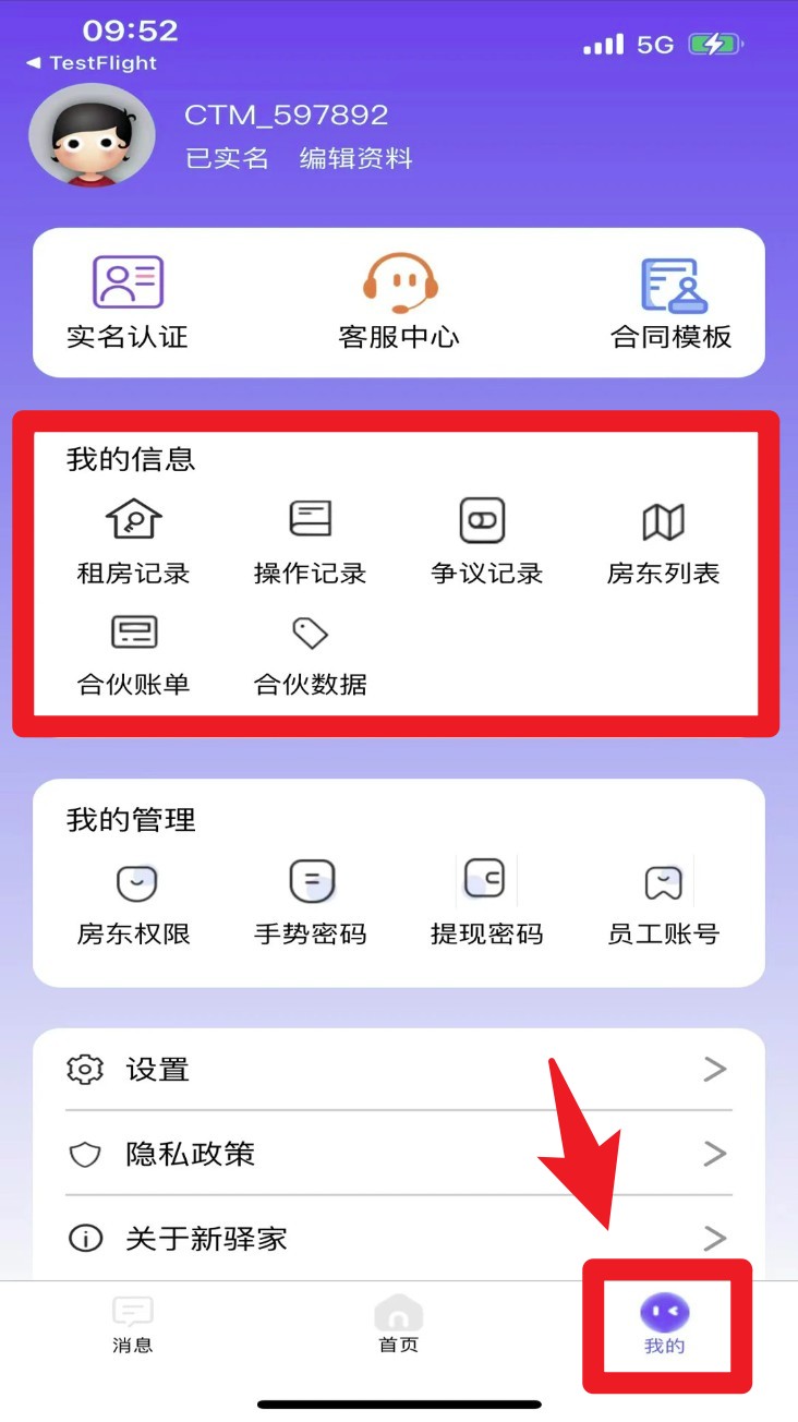 4. 进入我的页面查看租房记录、账单、合伙数据等个人信息与操作历史。