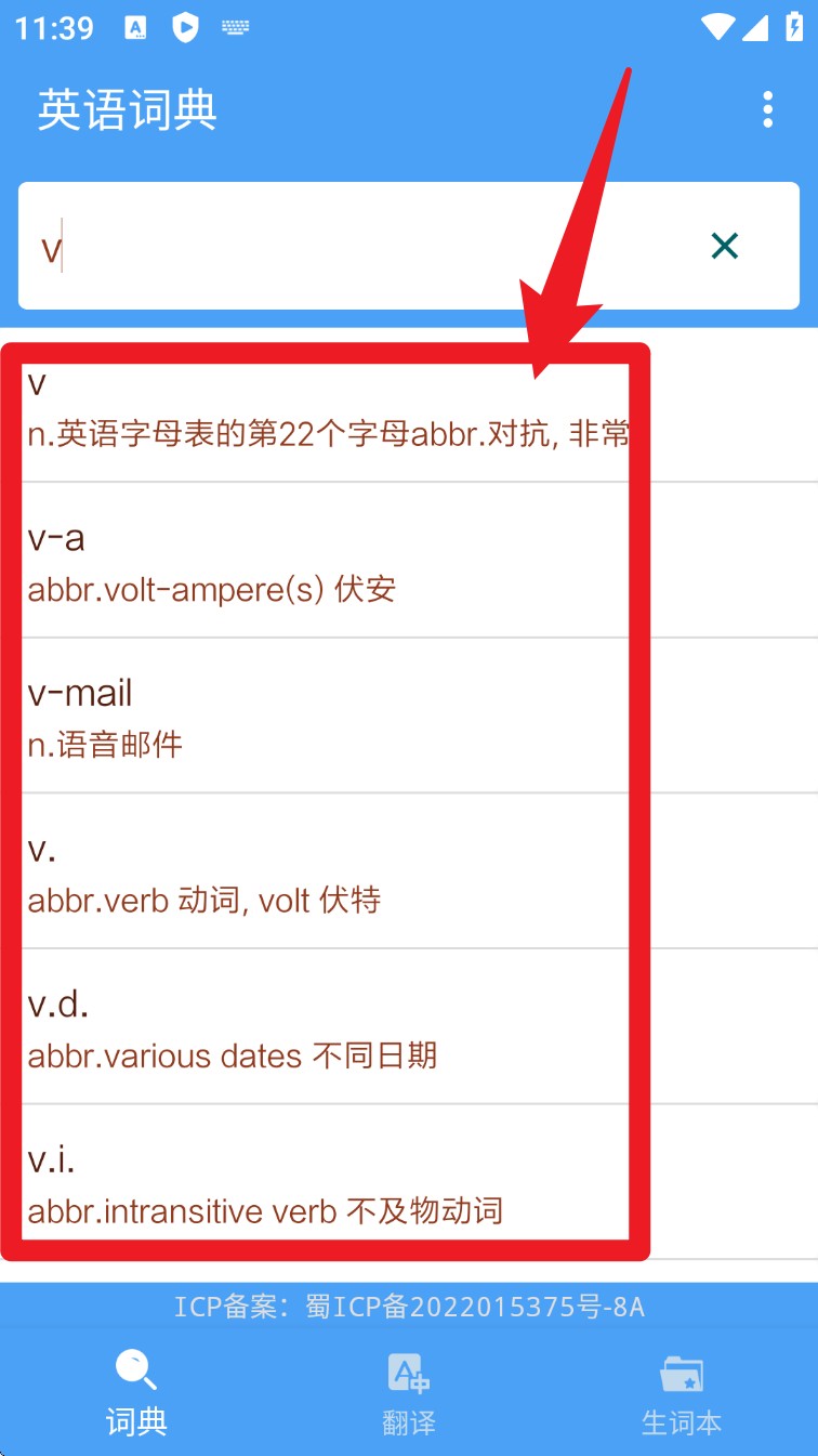 2. 输入字母后,会自动联想出相关词汇,点击列表中的词查看详细释义。