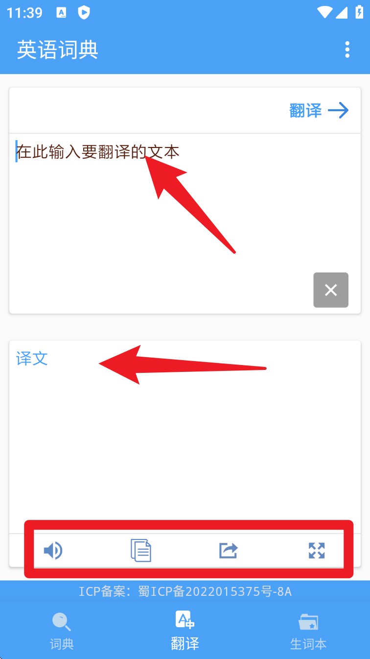 3. 切换到翻译标签页,输入整句文字,点击右上角的翻译按钮获取结果。