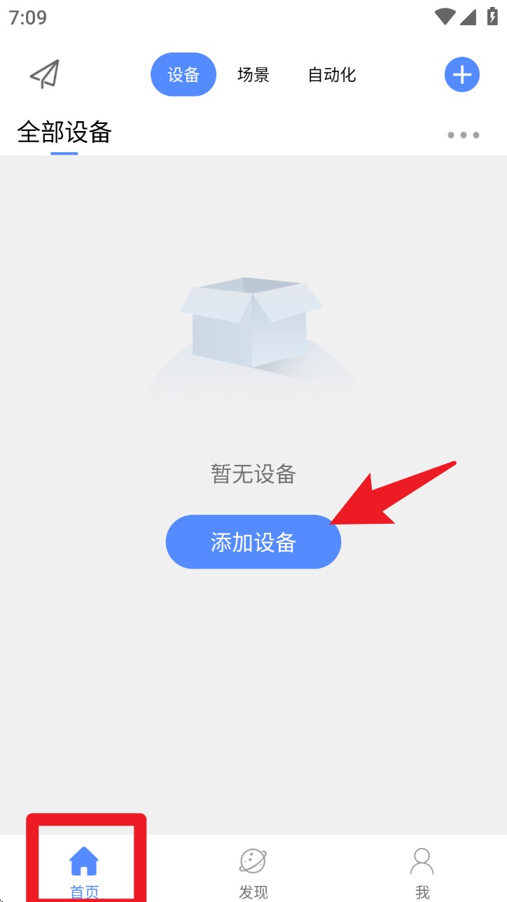 2. 注册成功后进入首页,点击中央的添加设备按钮,即可开始连接你的智能设备。
