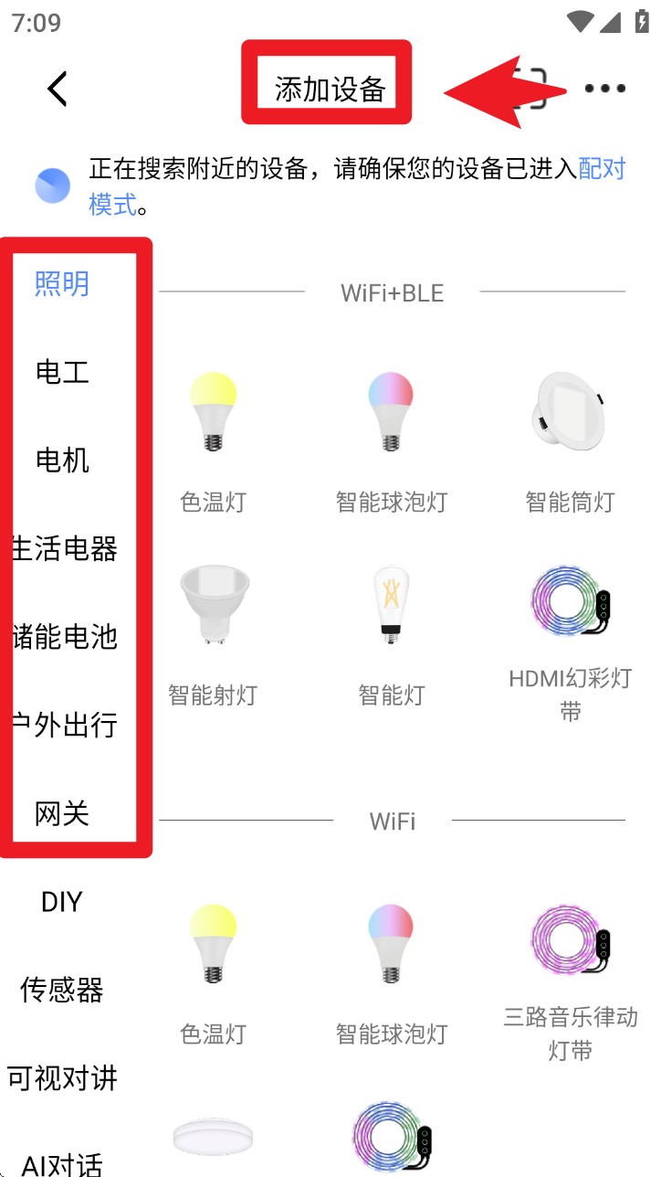 3. 在设备添加界面中,选择设备类型,如灯具、开关等,确保设备已进入配对模式后开始搜索。