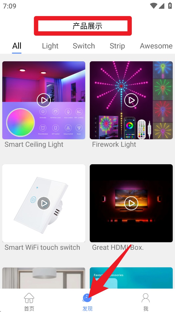 4. 点击下方发现进入产品展示区,可浏览支持的智能灯具、控制器等设备并查看演示功能。