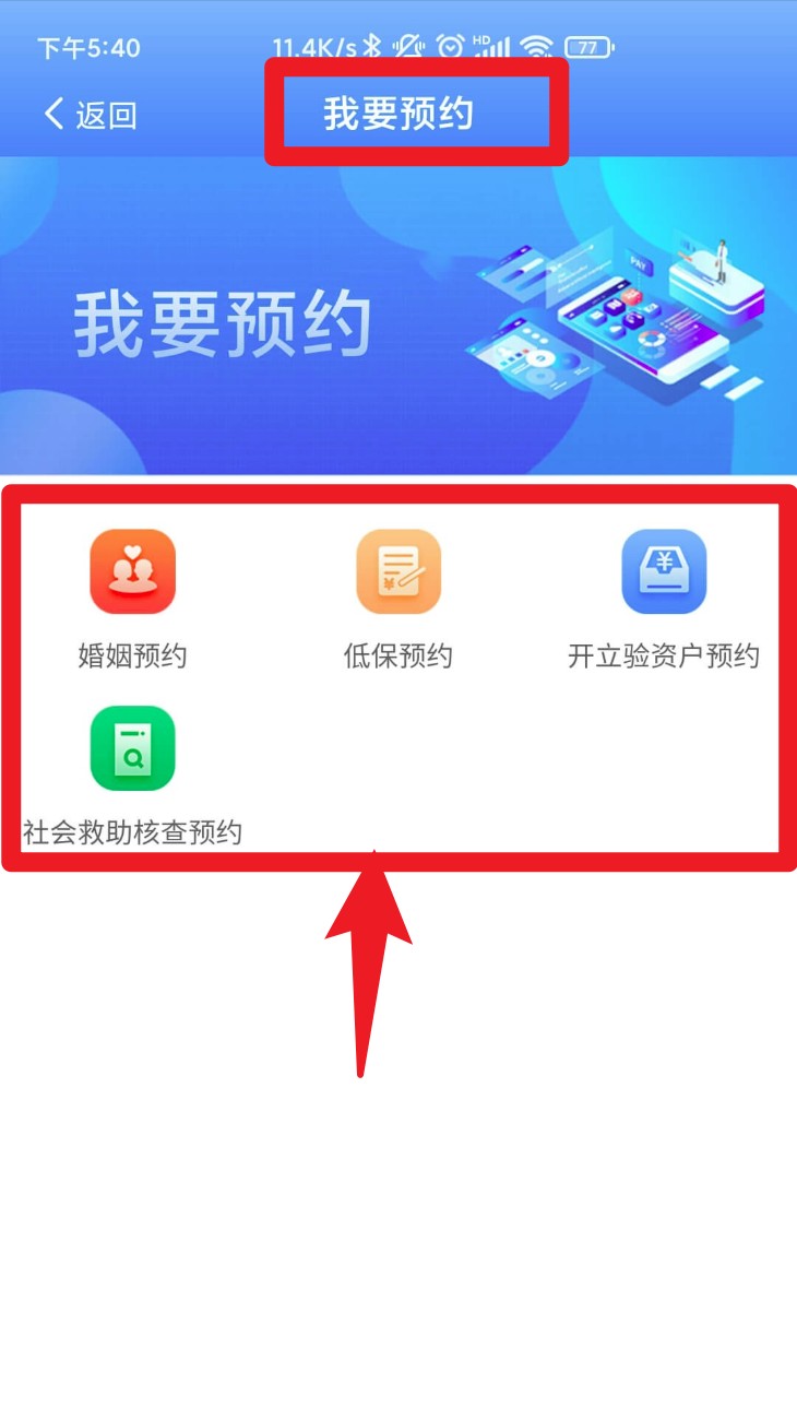 1. 进入首页后点击我要预约,可选择婚姻预约、低保预约、验资开户或社会救助核查等便民预约服务。