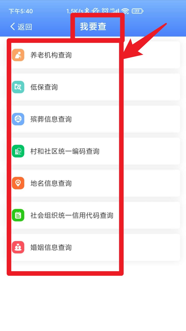 2. 点击我要查可快速进入查询页面,支持养老机构、低保、婚姻、村社编码等信息一键查询。