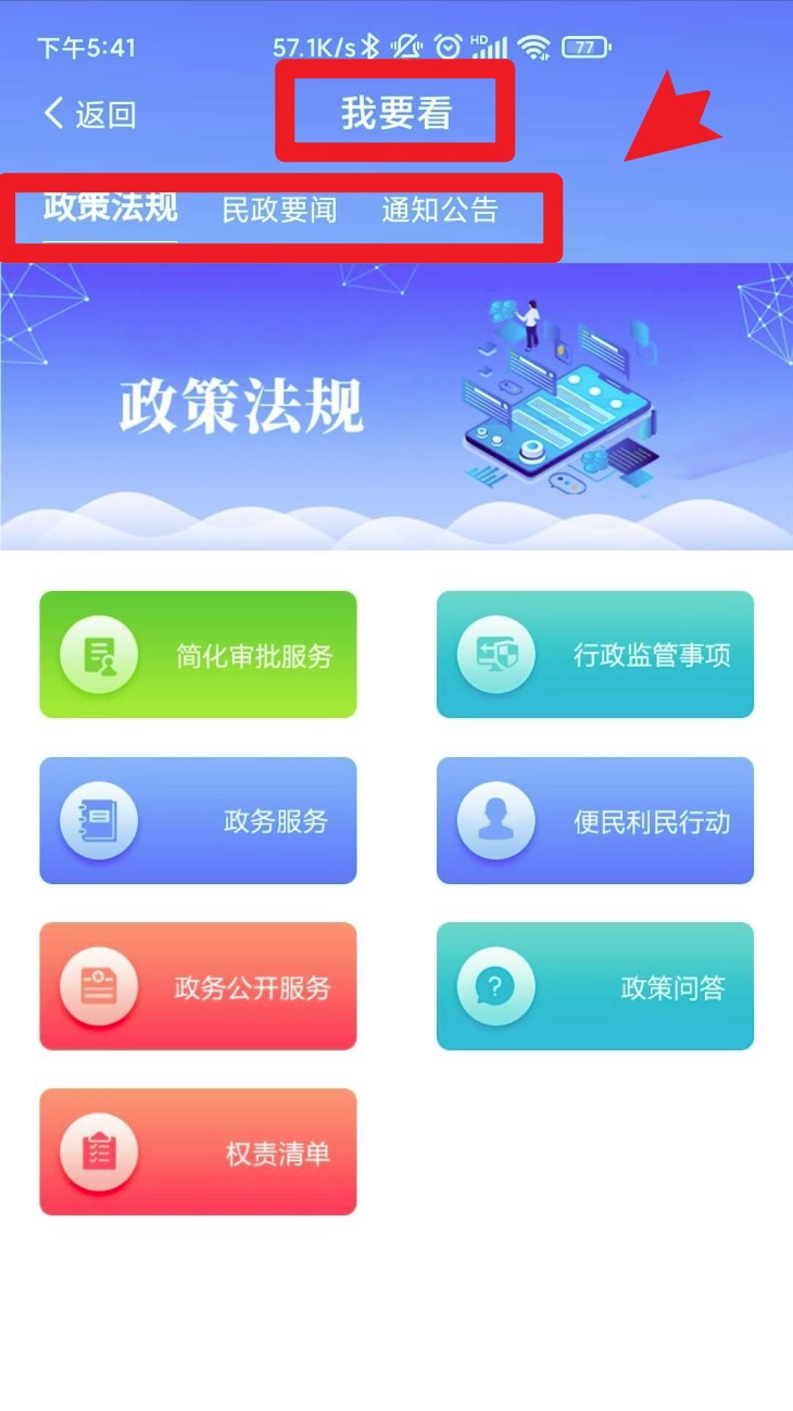 3. 通过首页我要看栏目,可查看政策法规、民政要闻、通知公告等最新政务资讯。
