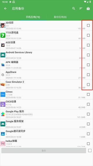 2、在应用备份界面,选择需要备份的应用,点击备份按钮启动备份流程。