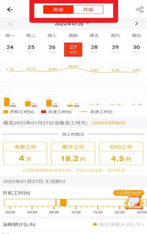 2、通过切换周报与月报按钮,可查看不同周期内设备的工时、油耗等详细统计数据。