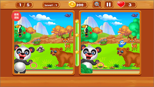 6、看左右两边的图片,找出他们的不同之处,用手指点击不同的地方即可,找出全部的不同击快完成游戏任务。