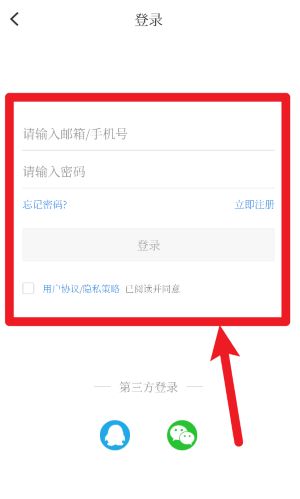1、点击登录界面后,输入绑定的邮箱或手机号和密码,再勾选协议确认选项,即可快速登录账号。