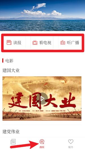3、点击底部融媒栏目,可进入读报、看电视、听广播等多媒体资讯服务页面。