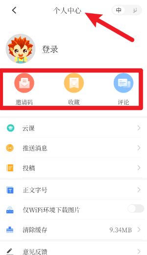 5、进入个人中心页面后,可以查看登录信息、管理收藏内容、输入邀请码和查看评论互动。