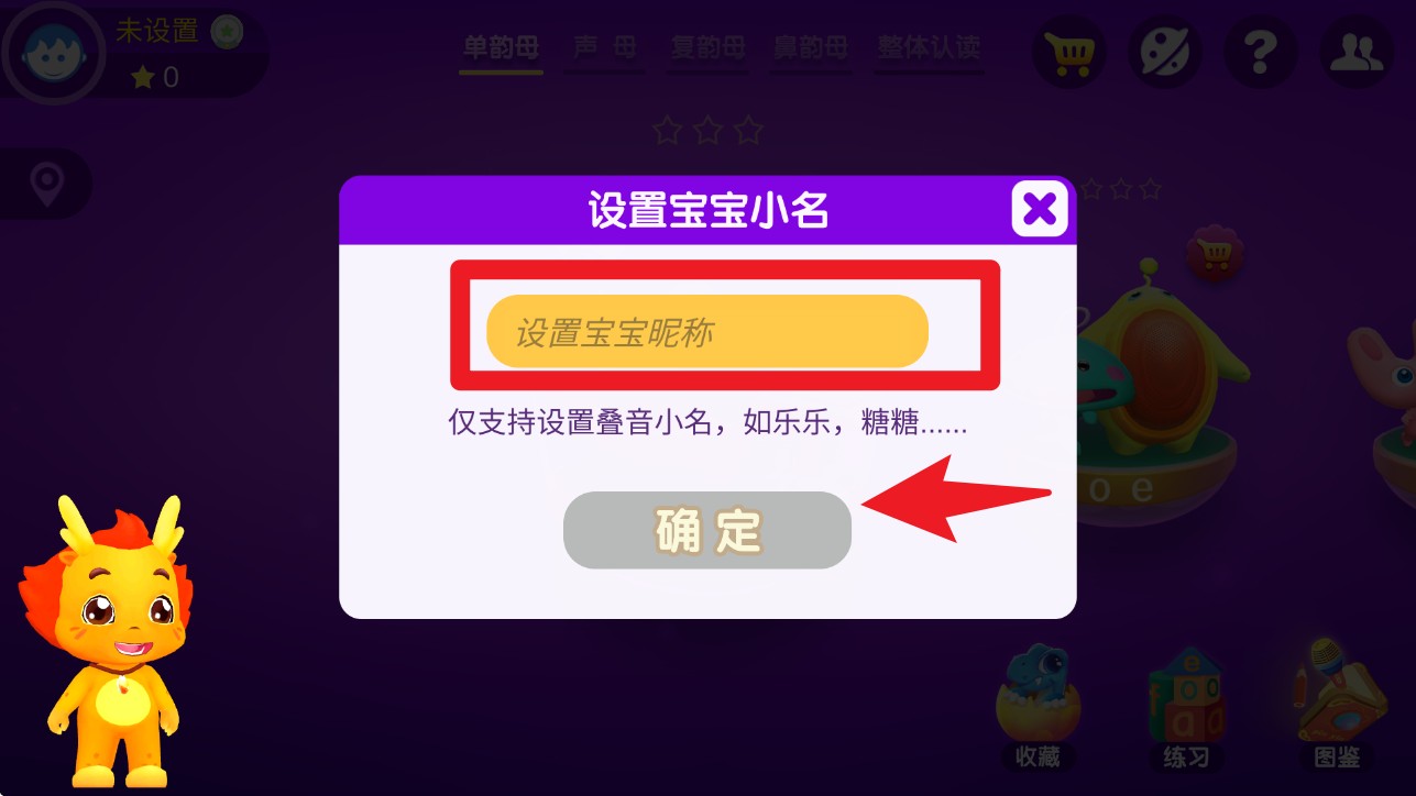 1. 进入主界面后,点击左上角头像图标,为宝宝设置一个可爱的昵称,输入完成后点击确定。