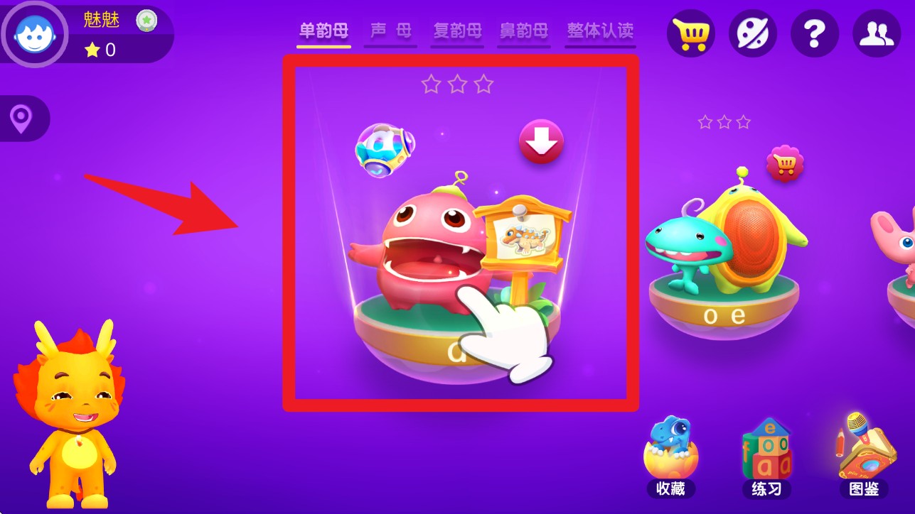 2. 显示主界面后,滑动至单韵母区块,选择你要学习的角色图标,如a,点击即可进入相应学习任务。