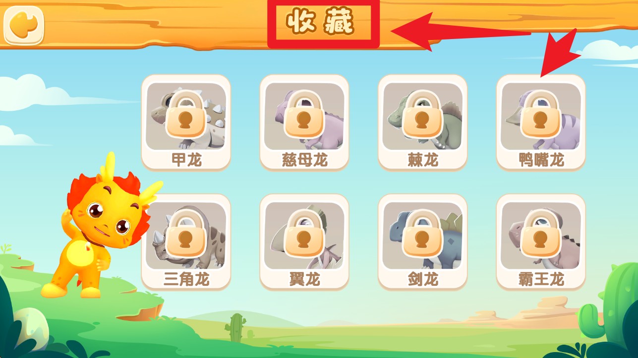4. 点击底部收藏按钮,即可查看已解锁或待解锁的恐龙角色,收集进度一目了然,激发宝宝学习动力。