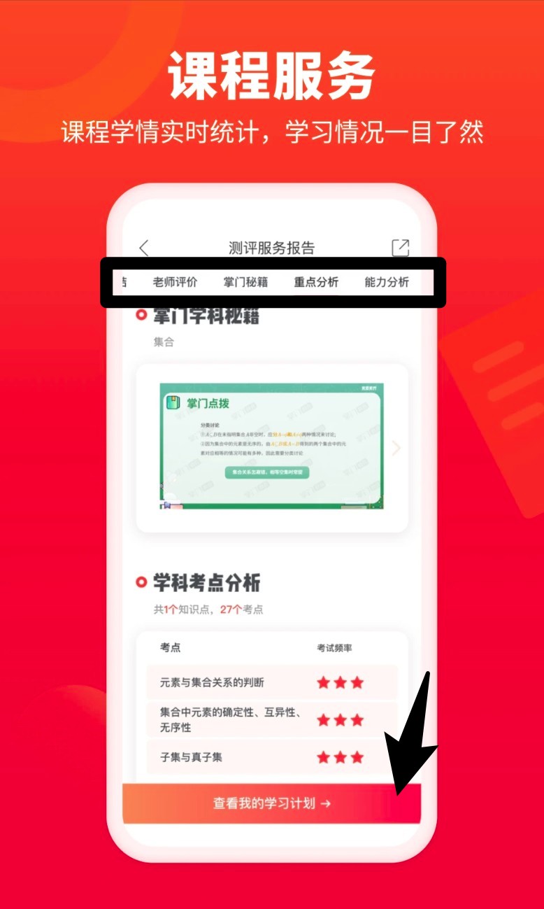 4. 点击课程服务中的查看我的学习计划按钮,立即查看阶段报告与重点考点分析。